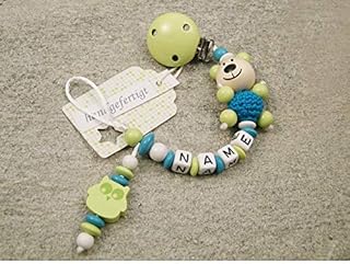 Baby SCHNULLERKETTE mit NAMEN - Schnullerhalter mit Wunschnamen - Mädchen Jungen Motiv Bär und Eule in lemon grün