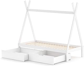 VitaliSpa Kinderbett Tipi Hausbett weiß Bett Kinderhaus Holz 90x200cm Als Umbauvariante Höhenverstellbar (Weiß, Bett mit Schubladenset)