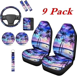 TOADDMOS 9 Stück schöne Hawaii-lila Sonnenuntergang Strand Palme Universal Vordersitzbezüge, Lenkradbezug, Armlehnenbezug, Sicherheitsgurt-Pads, Auto-Becherhalter-Untersetzer, Schlüsselanhänger